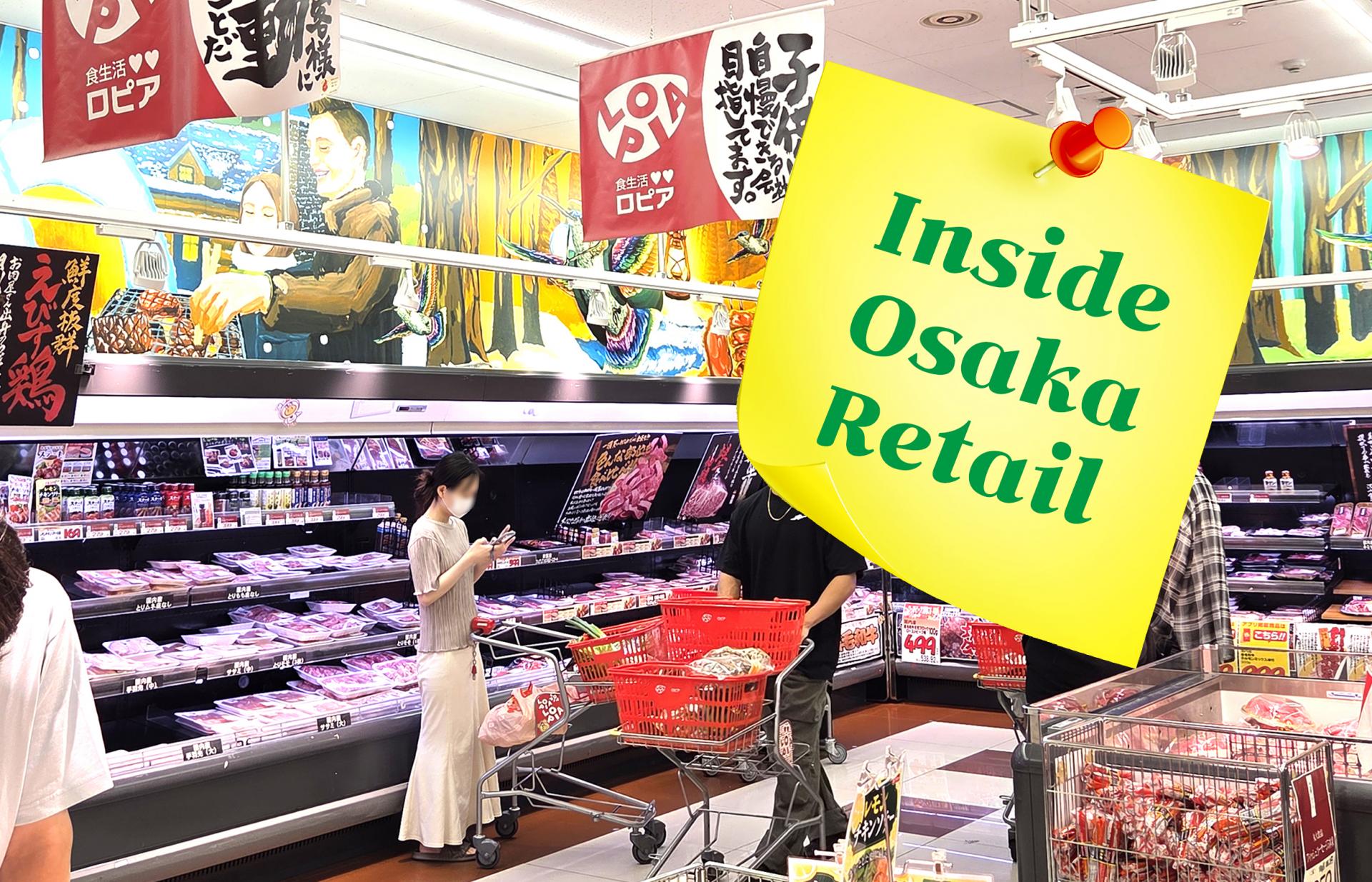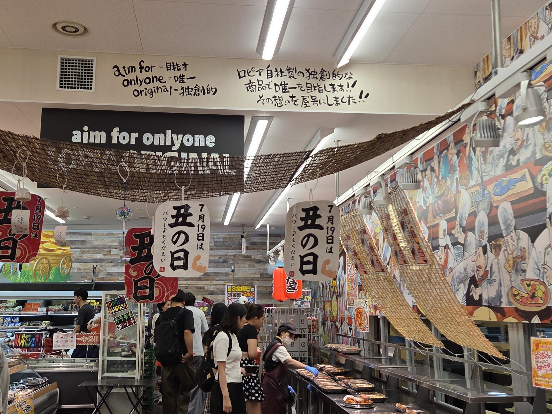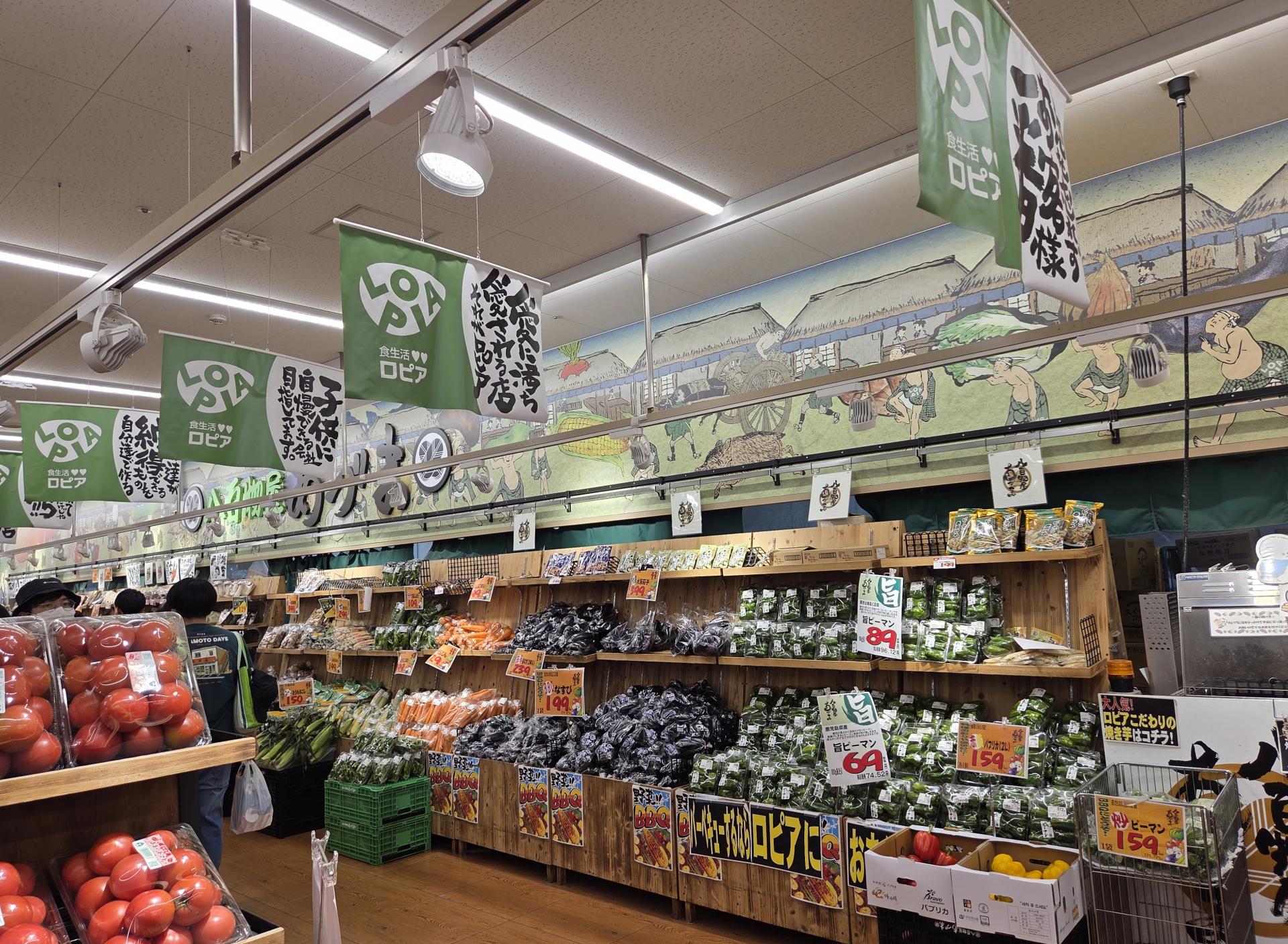 벽면에 색채감 있게 그려진 일러스트나 '야채는 선도'와 같은 로피아식 캐치프레이즈, 천장을 활용한 달리는 기차 연출 등 로피아만의 독특한 매장연출은 마치 오사카 도심 한복판에서 지역의 작은 축제를 즐기고 있는 듯한 쇼핑경험과 몰입감을 제공합니다.