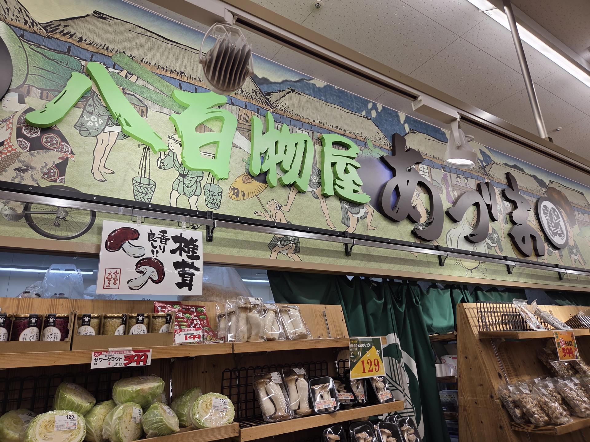 실제 로피아의 각 매장 코너에는 개인 상점처럼 상호가 붙어 있어요. 청과코너의 '야오모노야 아즈마(동쪽 청과점)', 정육코너의 '니쿠노 로피아(고기의 로피아)', 고치소 마르셰(진수성찬 마켓) 식입니다.