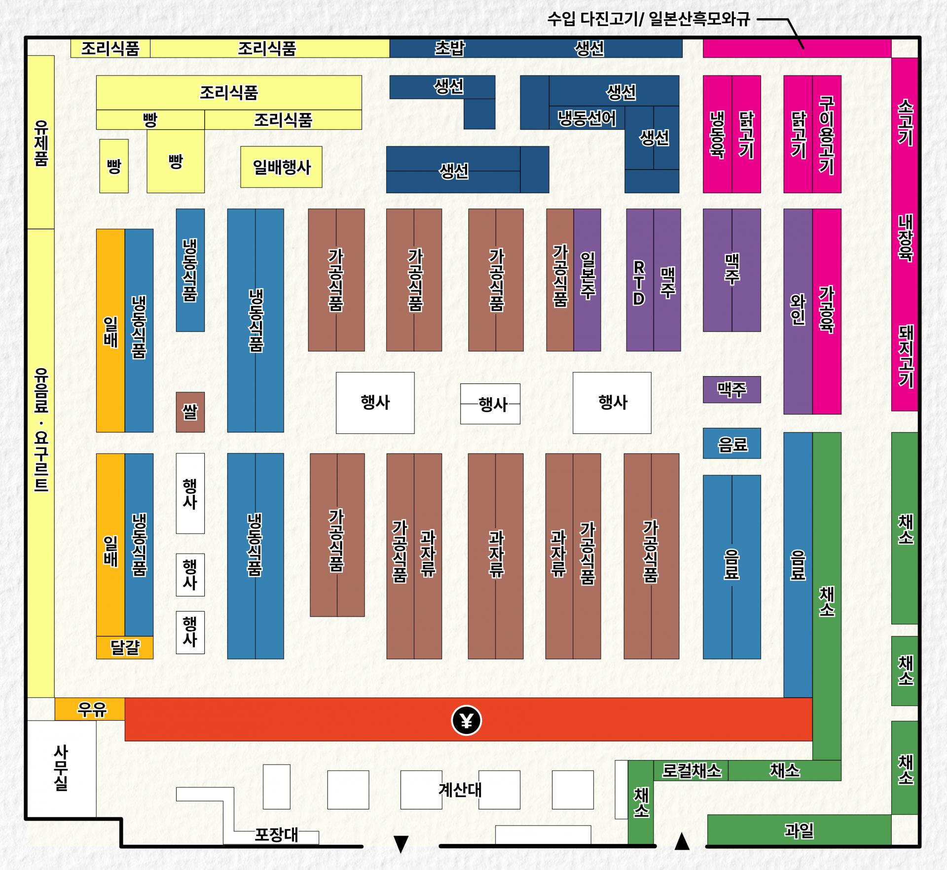 주통로를 따라 벽면에 신선식품을 진열했어요.