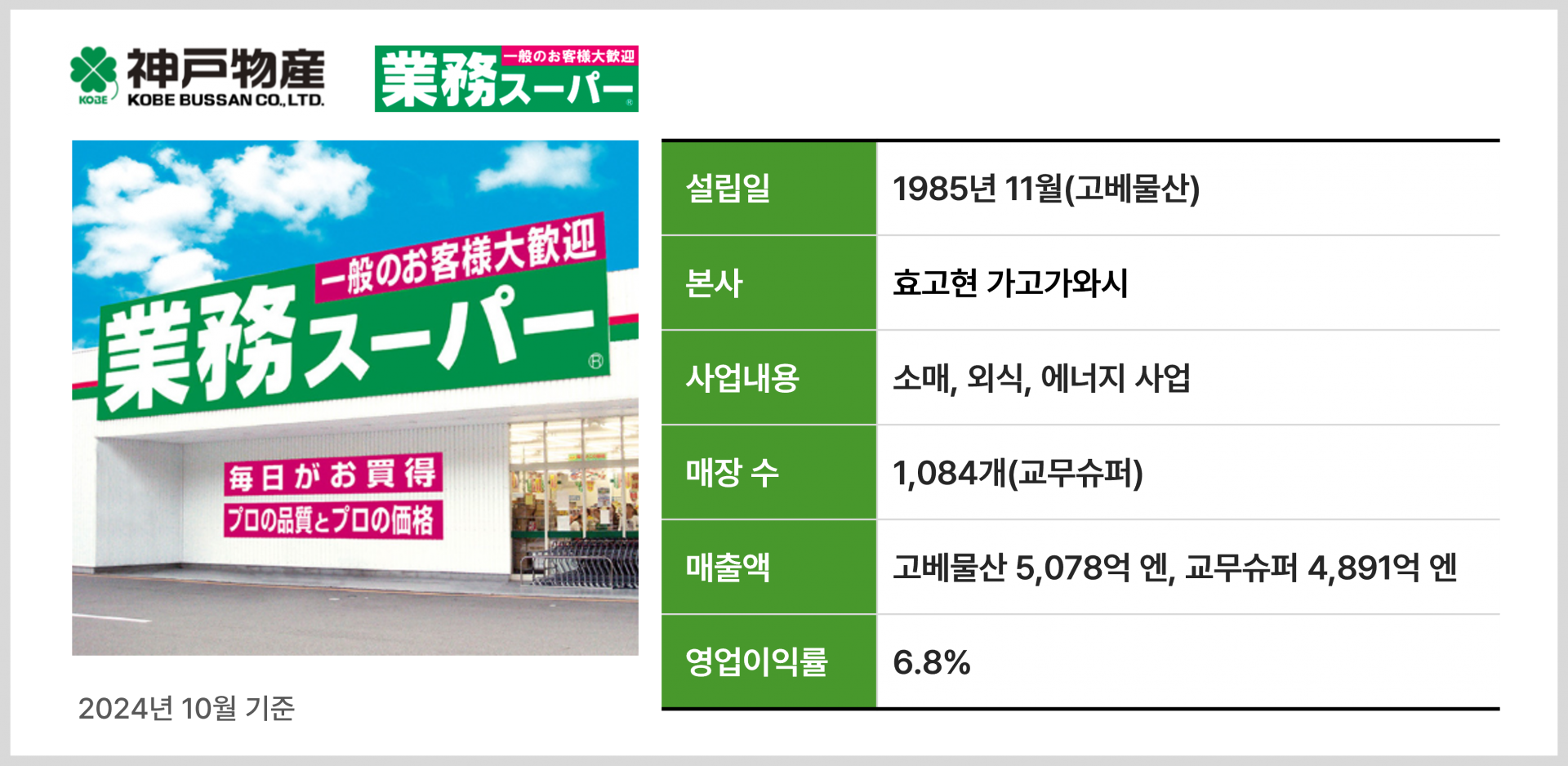 일본 고베물산이 운영하는 '교무슈퍼' 역시 인수합병을 통해 식품의 제조-판매 일체화를 실현한 대표적인 소매기업입니다. 우리나라에서는 한자음 그대로 '업무슈퍼(業務スーパー)'라는 명칭으로 더 잘 알려져 있죠.