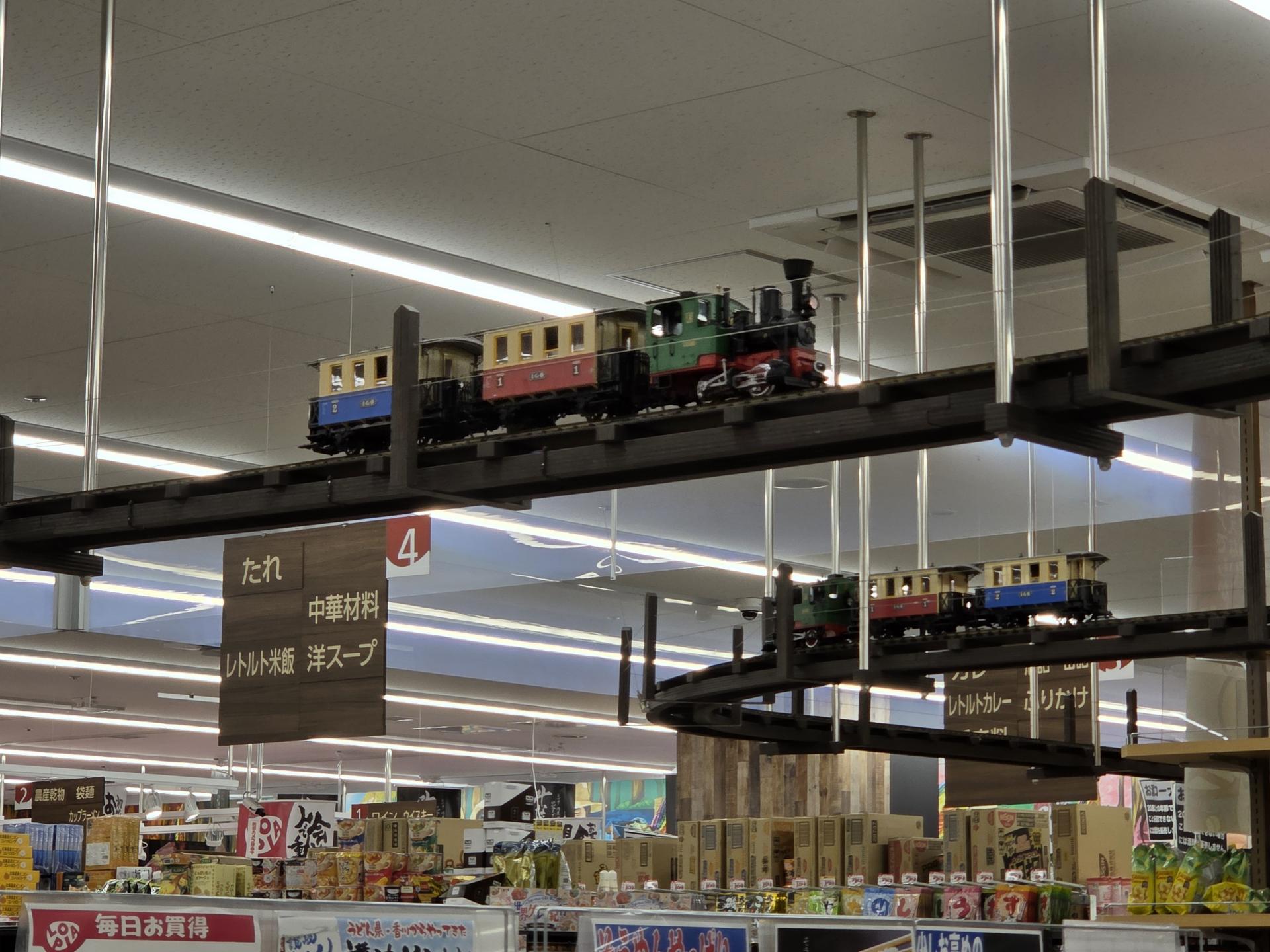 매장 천장에 설치된 달리는 기차가 색다른 경험을 제공합니다. |