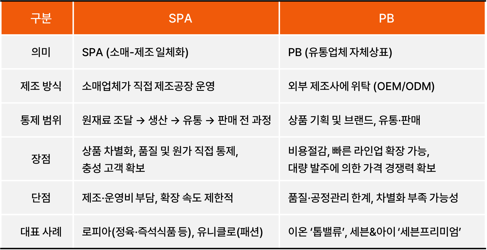 반면, SPA는 제조 인프라를 소매기업이 직접 갖추고 상품기획은 물론 원재료 조달부터 품질, 원가까지 전 과정을 관리하는 모델입니다. 패션업계의 유니클로나 자라식 상품개발이 식품 분야에 적용된 것으로, 상품의 차별화와 원가 경쟁력을 동시에 확보할 수 있다는 강점이 있습니다.