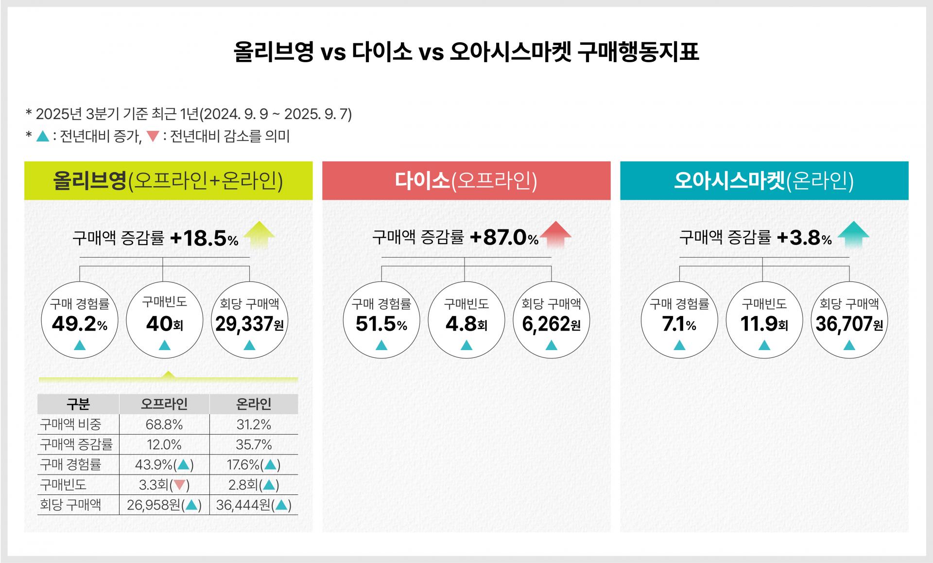 2025년 3분기 기준, 세 기업의 일용소비재 구매액은 모두 전년대비 증가했습니다. 다이소가 87%로 증가세가 가장 가팔랐고 올리브영 18.5%, 오아시스마켓도 3.8% 증가했어요.