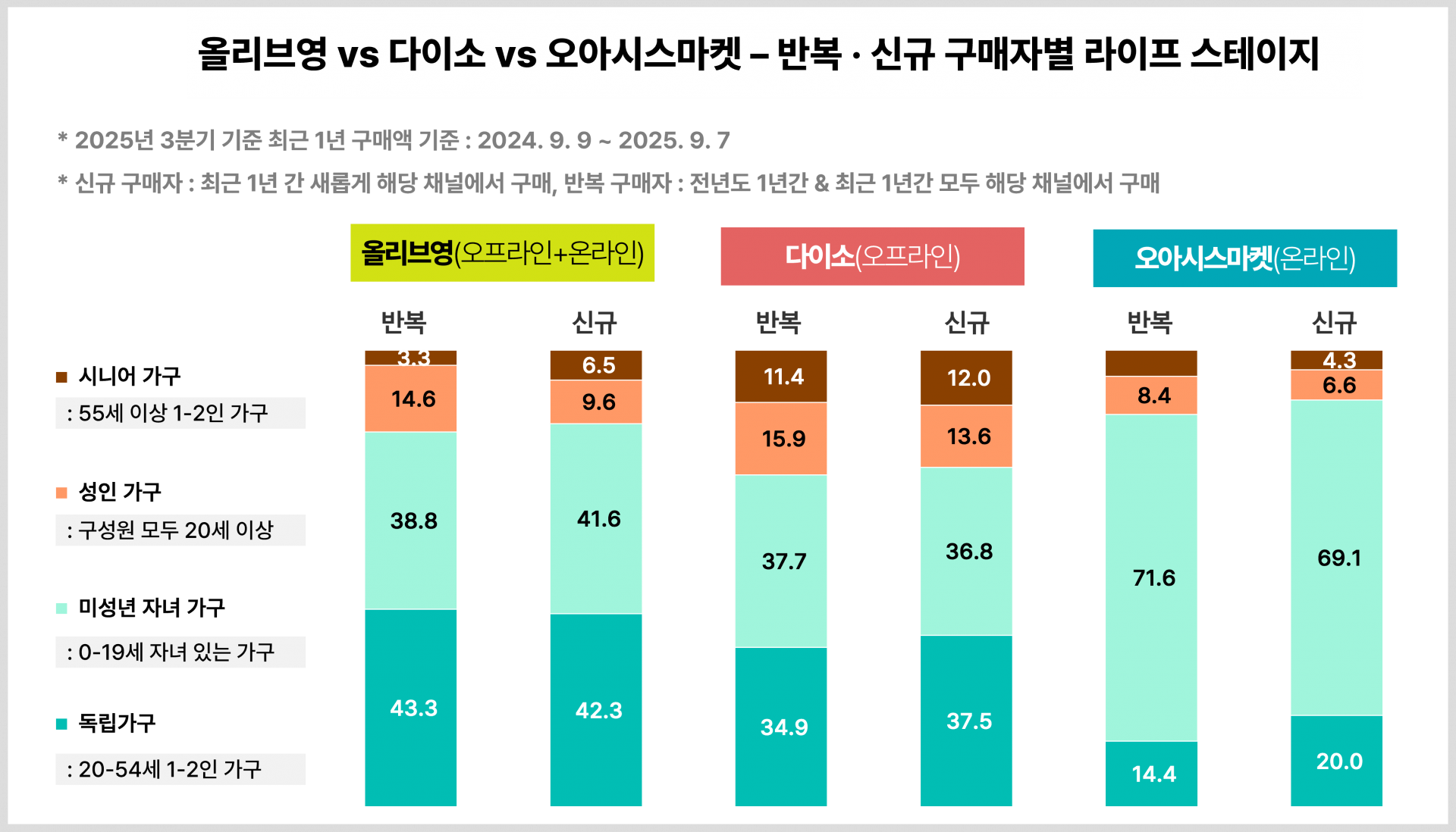 올리브영, 다이소, 오아시스를 이용하는 고객들의 가구 구성을 신규 구매자와 반복 구매자로 나눠 분석해 봤어요.