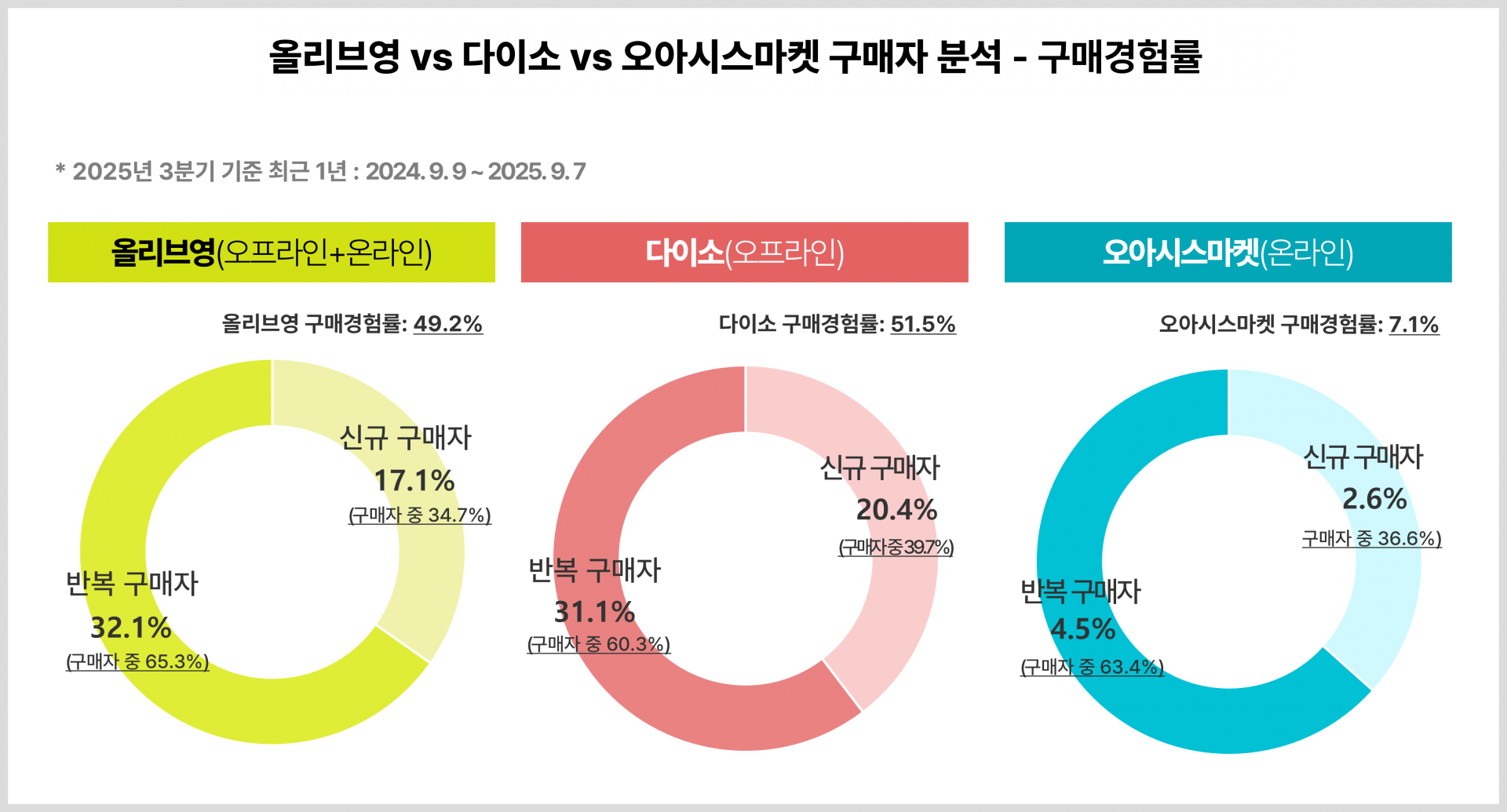 정리하면, 다이소와 올리브영은 신규 구매자 유입, 오아시스는 기존 고객의 구매 증가가 성장에 더 기여했습니다.