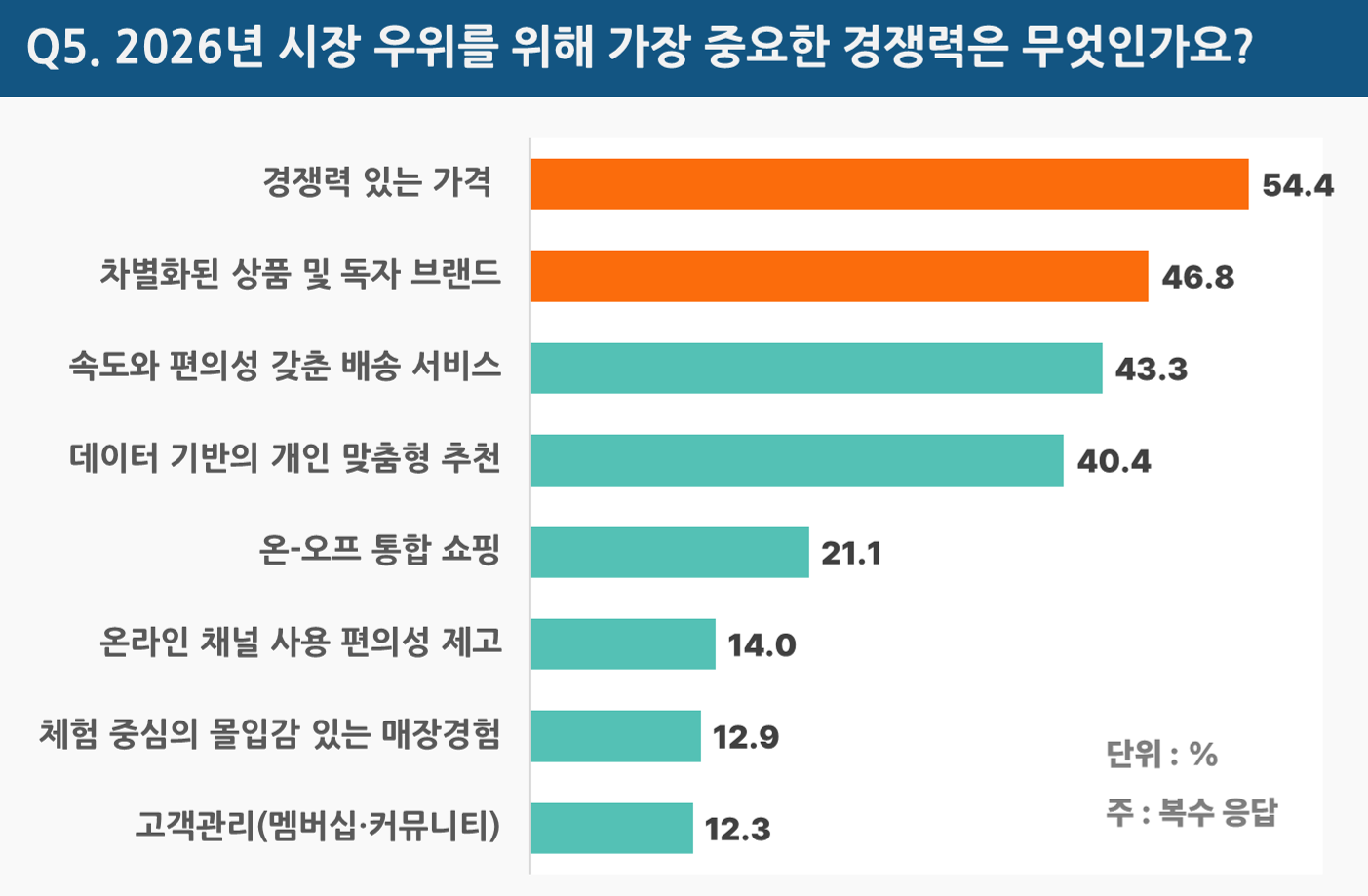 내년도 시장 우위 확보를 위해 가장 중요한 요소를 묻는 질문에 54.4%가 '경쟁력 있는 가격'을 꼽았습니다(그림 5 참고, 복수응답). ‘가성비’가 수년간 핵심 소비 트렌드로 자리 잡을 만큼 소비자들의 가격 민감도가 높아진 현실이 반영된 결과로 해석됩니다.