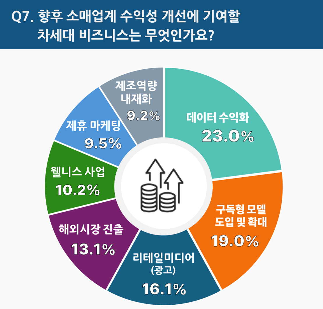 수익개선에 기여할차세대 비즈니스 1위 '데이터' 그렇다면 소매업계 수익성 개선에 가장 보탬이 될 사업 영역은 무엇일까요? 업계 종사자들은 수익개선을 위한 차세대 비즈니스 1위로 데이터 수익화를 꼽았습니다. 데이터 수익화는 유통사가 보유한 고객구매 데이터를 분석, 가공해 필요한 업체에 제공함으로써 새로운 매출원을 창출하는 비즈니스 모델로, 이미 일부 기업들이 사업화에 나섰습니다. 데이터 분석 기술이 고도화되면서 타깃 마케팅이나 수요예측 등 다양한 영역에서 활용도가 높아 향후 유통기업의 추가 수익원으로 자리 잡을 것으로 보입니다. 두 번째 수익모델은 '구독형 모델 도입 및 확대(19.0%)'가 꼽혔습니다. 코스트코가 정착시킨 유료 멤버십 제도는 상품 판매 외에 회비라는 안정적인 고정 매출을 발생시킨다는 점에서 최근 많은 기업들이 도입하고 있는 모델인데요. 수익창출뿐 아니라 충성도를 높이고 고객 이탈을 최소화하는 수단으로도 활용되고 있습니다. 세 번째 수익모델로 꼽힌 '리테일미디어(16.1%)' 즉 광고 사업은 유통사가 플랫폼으로서의 장점인 구매행동 데이터를 활용해 맞춤형 광고를 제공하는 사업입니다. 비용 대비 높은 이익률을 창출할 수 있어 아마존이나 월마트 같은 글로벌 리딩 기업들이 가장 적극적으로 추진하고 있는 차세대 비즈니스이기도 하죠. 이외에도 '해외시장 진출(13.1%), '웰니스 사업 진출(10.2%)', '어플리에이트 등 제휴 마케팅(9.5%)'이 유통업계 수익성 개선을 위한 사업으로 꼽혔습니다.