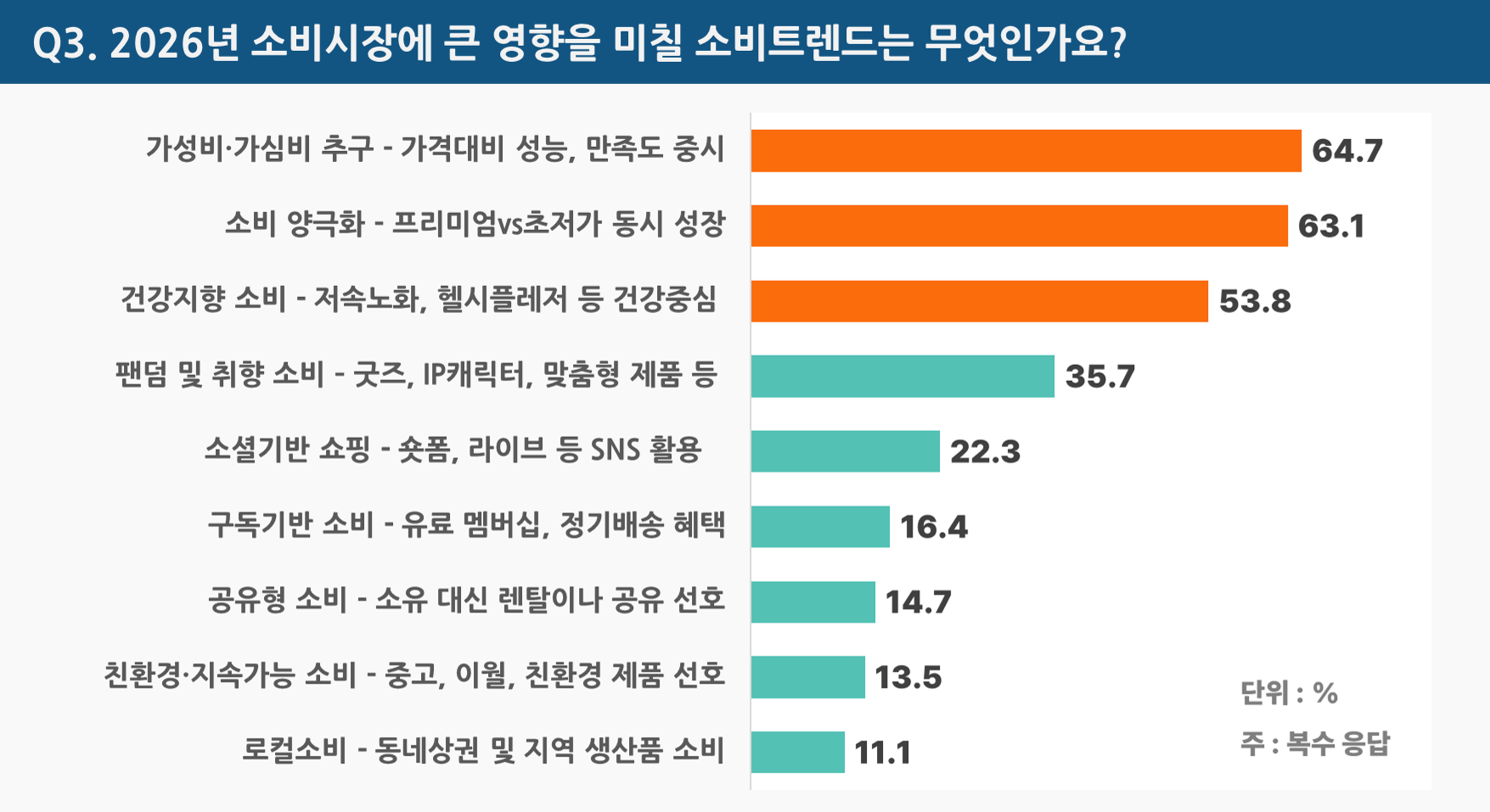 2026년 소비시장에 가장 큰 영향을 미칠 소비 트렌드를 묻는 질문에 64.7%가 ‘가성비·가심비 추구’를 선택했어요(그림 3 참고, 복수응답). 2위를 차지한 ‘소비 양극화(63.1%)’ 역시 가치소비를 지향하는 소비 트렌드와 맥을 같이 하며 수년간 이어져오고 있는 트렌드입니다.