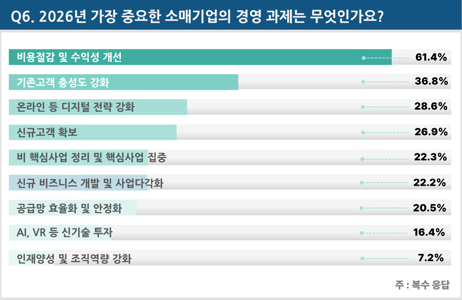2026년 소매기업의 가장 당면한 과제는 ‘효율화'인 것으로 나타났습니다. 응답자 가운데 61.4%가 가장 중요한 소매기업의 경영 과제로 '비용절감 및 수익성 개선'을 꼽았으며, 5위를 차지한 '비 핵심사업 정리 및 핵심사업 집중(22.3%)' 역시 효율화의 연장선으로 해석됩니다(그림 6 참고, 복수응답). 또한 '기존고객 충성도 강화(36.8%)'와 '신규고객 확보(26.9%)'가 2위와 4위를 차지해 고객 점유율 경쟁이 치열하게 전개되고 있는 업계 상황을 반영했습니다.