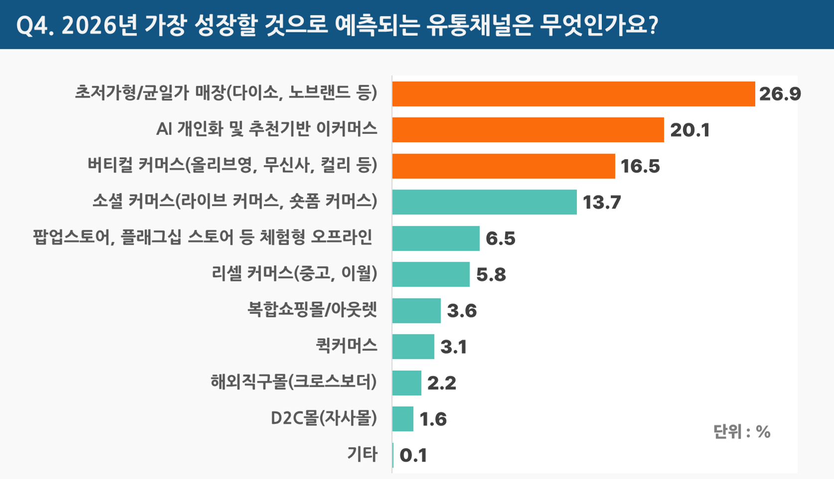 ‘2026년 가장 성장할 것으로 예상되는 유통채널’을 묻는 질문에 가장 많은 26.9%가 '다이소·노브랜드 등 초저가 매장'을 선택해 가치소비 흐름이 채널 선호에도 뚜렷하게 반영됐습니다(그림 4 참고).