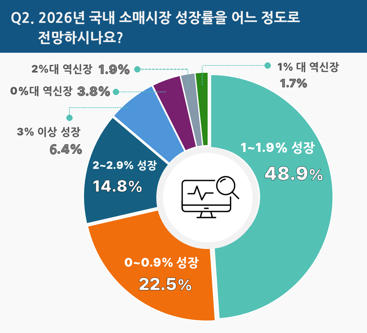 2026년 소매시장 성장률은 '1%대'를 예상하는 응답자가 48.9%로 가장 많았고, 2%대 성장을 전망한 응답자도 14.8%로 세 번째 높은 응답률을 보였습니다(그림 2 참고). 상승폭은 크지 않지만, 올해 9월 기준 소매시장 성장률 0.7%를 상회하는 수치로, 국내 유통시장을 둘러싼 각종 대내외 불확실성이 연말을 기점으로 완화되면서, 내년도 소비시장에 대한 점진적 회복 기대감이 반영된 결과로 풀이됩니다.
