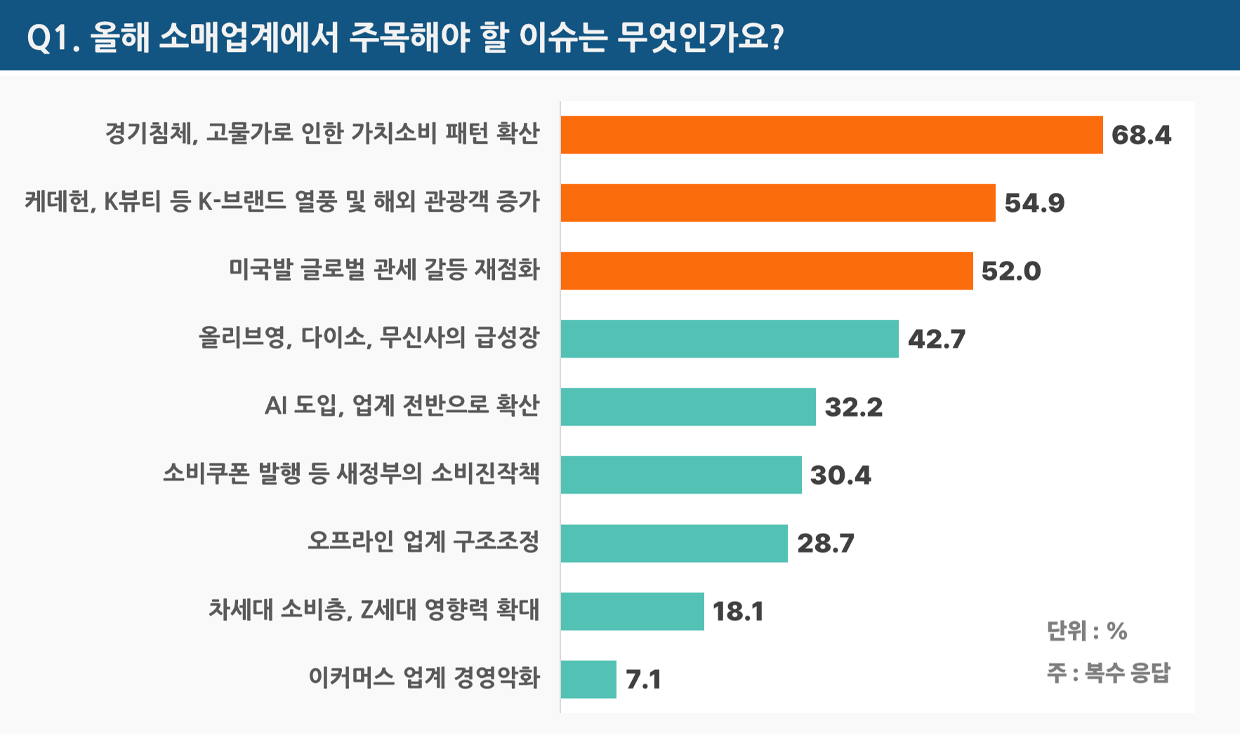그 외에 이른 바 '올다무'로 불리는 '올리브영, 다이소, 무신사의 급성장(42.7%)', 'AI 도입, 업계 전반으로 확산(32.3%), '소비쿠폰 발행 등 새정부의 소비진작책(30.4%)도 올 한해 유통업계 관심을 끈 주요 이슈였습니다.